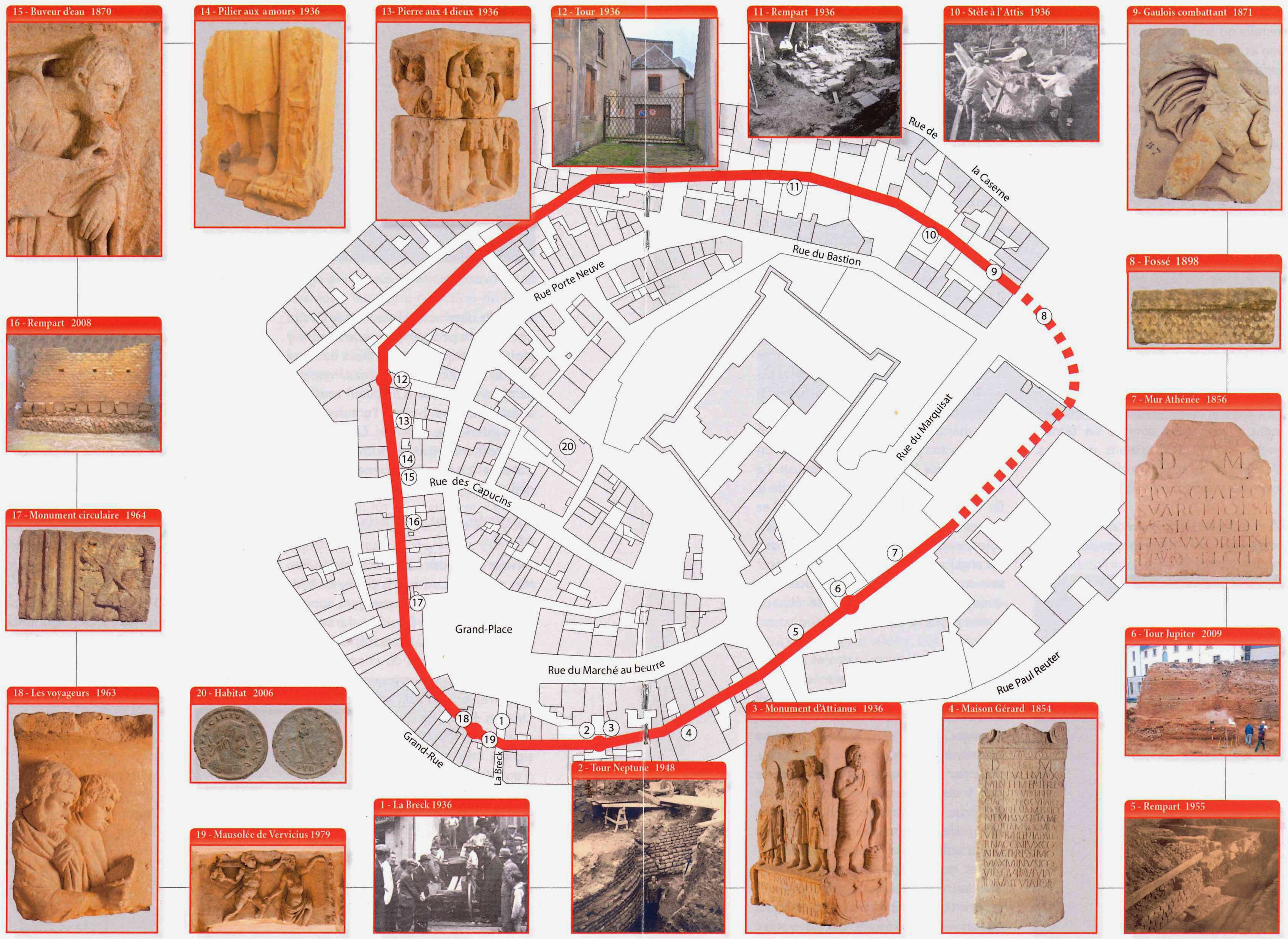 In 1979, Louis Lefèbvre took the opportunity of the renovation of the café on the corner of the Grand Place, near the place known as "la Breck", to continue his observations at the base of the tower discovered 15 years earlier. At the base of one of the towers in the Roman enclosure, a total of 23 carved blocks dating from the 2nd or 3rd century AD were discovered, as the archaeologist explains: