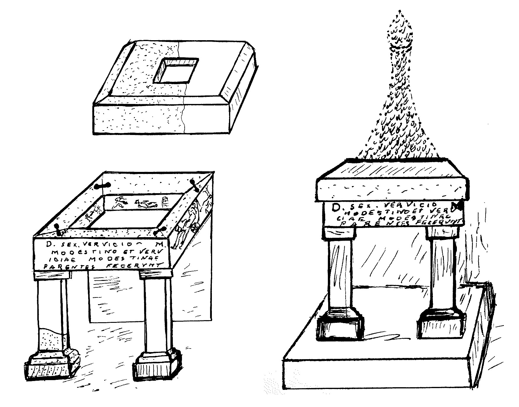 La reconstitution du mausolée de Vervicius et Vervicia, tel qu’il est encore aujourd’hui présenté, a été réalisée en 1984 par Louis Lefèbvre, ancien conservateur du musée d’Arlon. En analysant les blocs, il a constaté que six d’entre eux pouvaient être replacés au sein d’un même monument, de par leur matériau, leur géométrie et leur lieu de découverte commun. Il considéra que les quatre blocs présentant des scènes s’agençaient en carré et reposaient sur deux piliers vers l’avant et contre un autre édifice à l’arrière. De même, une grande dalle carrée et taillée en biseau a été découverte lors des fouilles. Celle-ci, selon lui, pouvait constituer, au moins en partie, la couverture du mausolée.